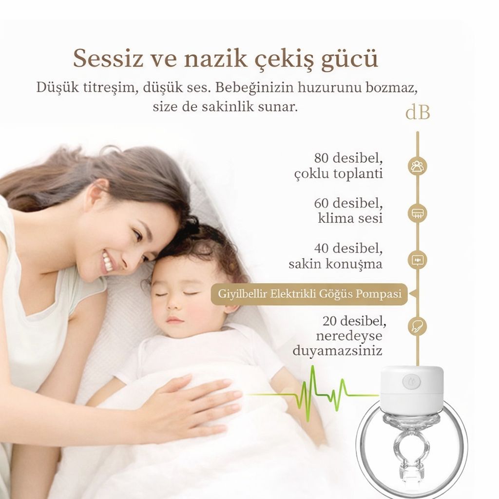 Sessiz çalışma sistemi sayesinde bebeğin uyurken bile rahatlıkla kullanılabilir. Gece sağımı için idealdir. Dış ortamda dikkat çekmez, konforlu bir deneyim sunar.