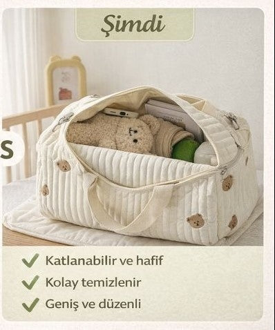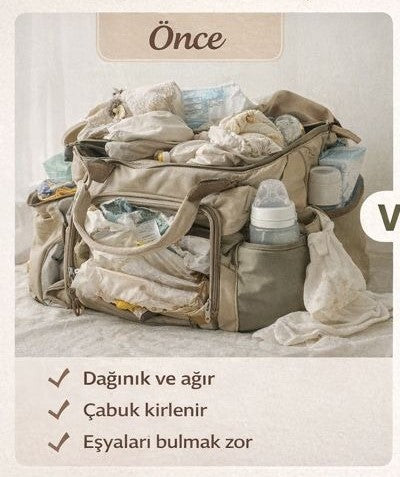 Bezden biberona, kıyafetten minik bakım ürünlerine kadar her şeyi düzenli tutan pratik iç cepler.